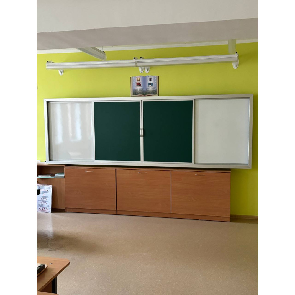 Рельсовая система представляет собой единую конструкцию, состоящую из каркаса и четырех рабочих поверхностей с магнитно-меловым, магнитно-маркерным или комбинированным покрытием.