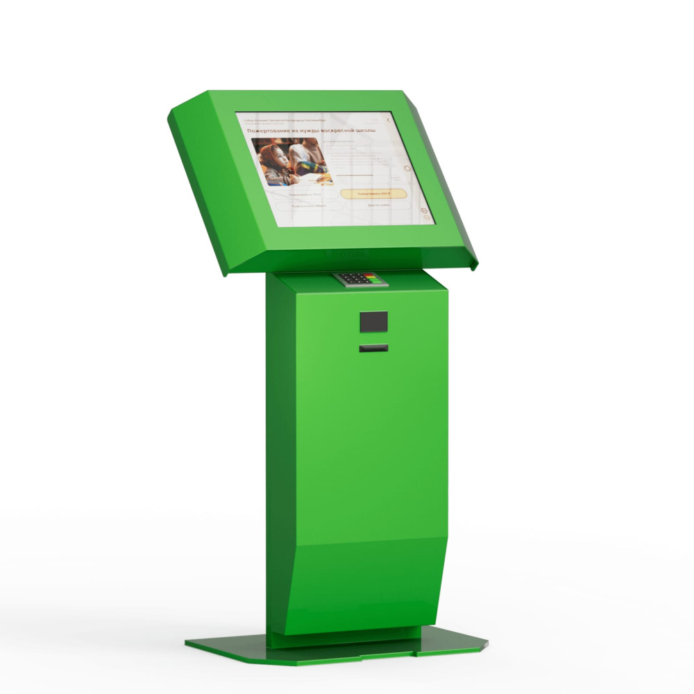 Обеспечивает моментальную оплату безналичным способом, выдаёт чек (есть возможность отправить чек на электронную почту, что позволяет оптимизировать затраты на расходные материалы). Терминал оснащён ярким сенсорным экраном 24″, мощным вычислительным блоком, картоприёмником и термопринтером. Встроенный акустический динамик, транслирующий необходимую информацию, привлечёт внимание покупателей. Управление — микроконтроллер.