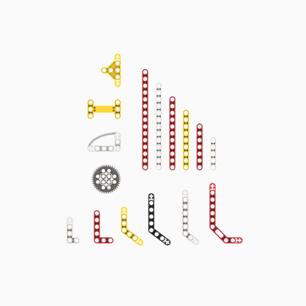 В комплект входят 52 детали, среди которых балки и шестерни.