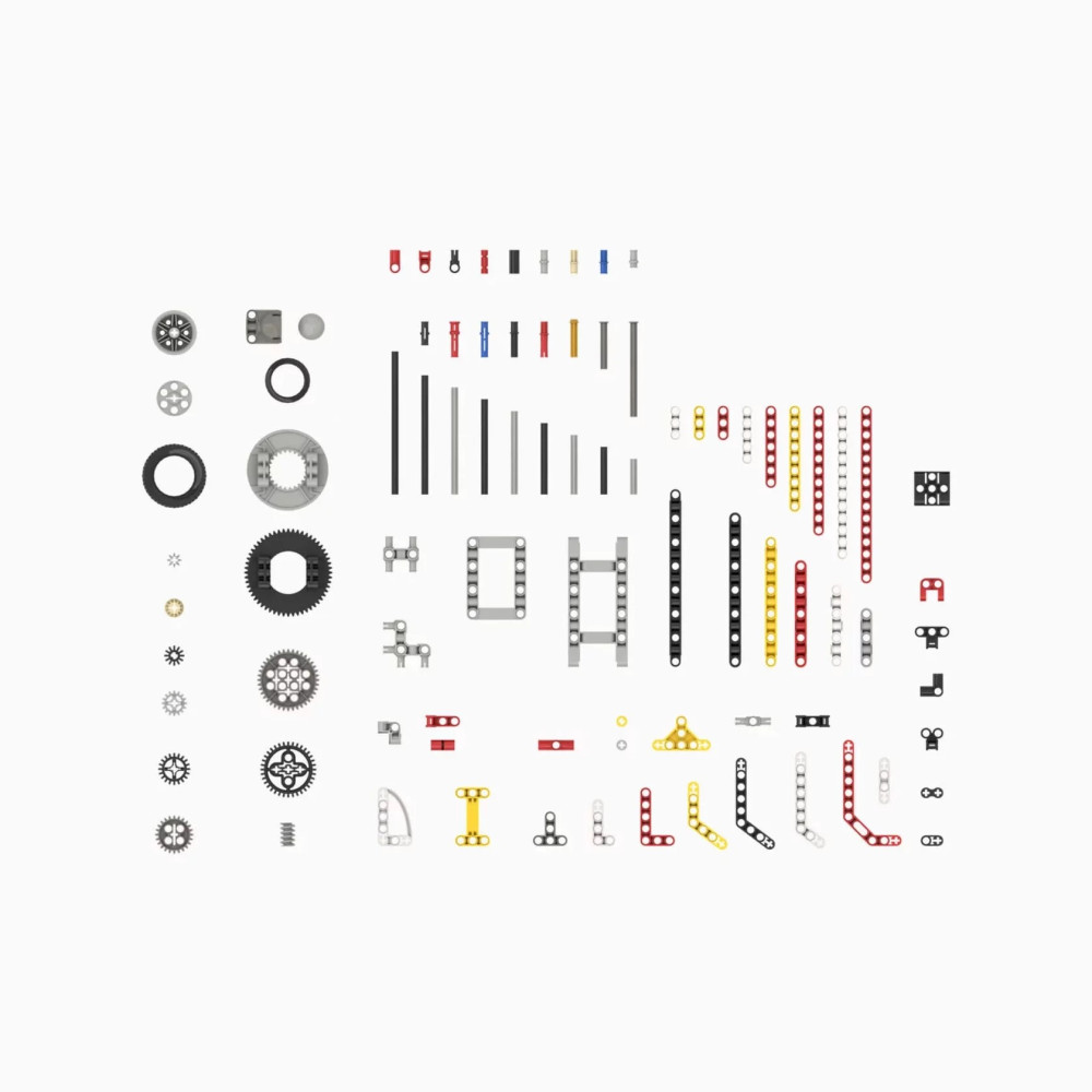 В комплект входят 320 деталей, среди которых шестерни, колеса, балки и крепежные детали.