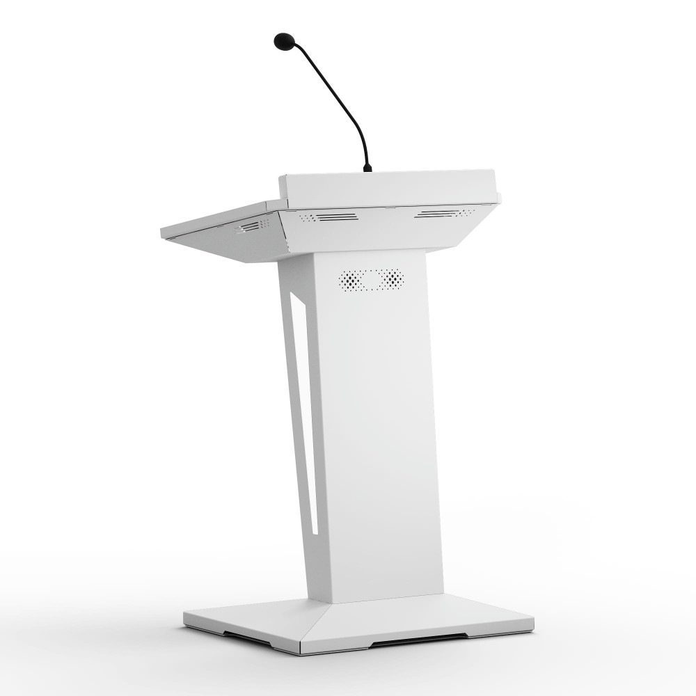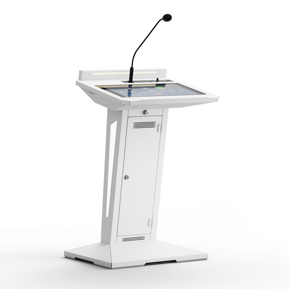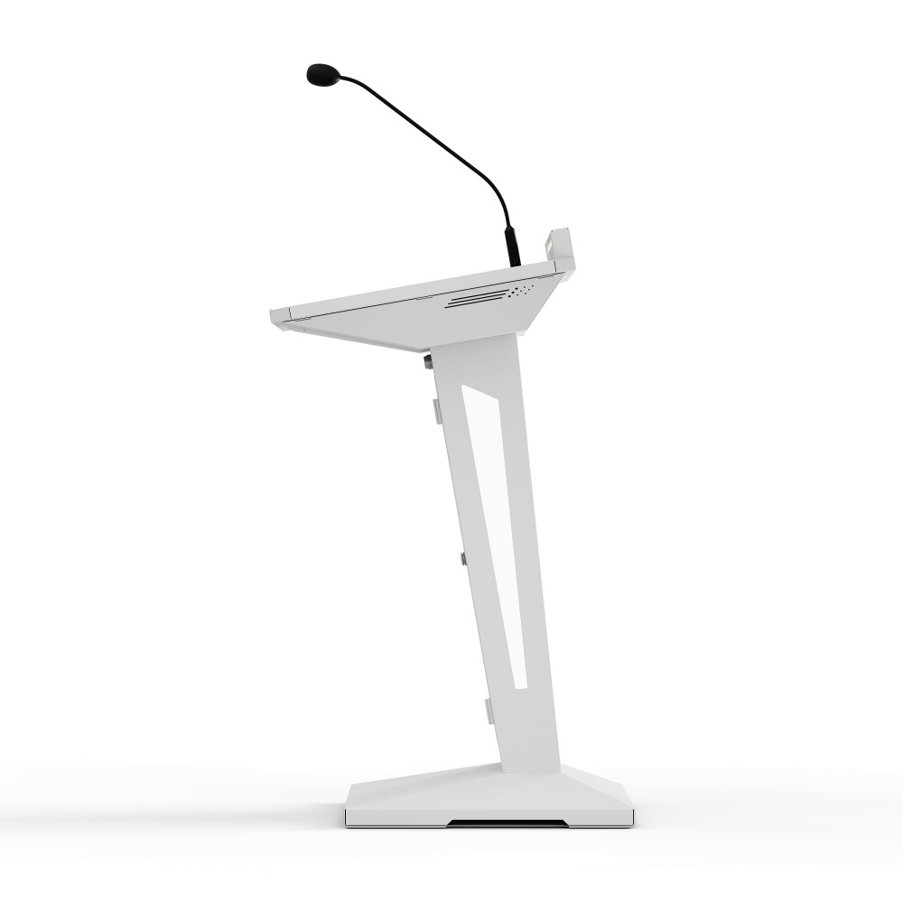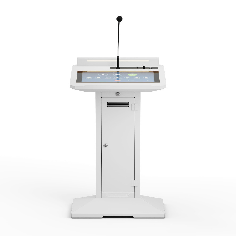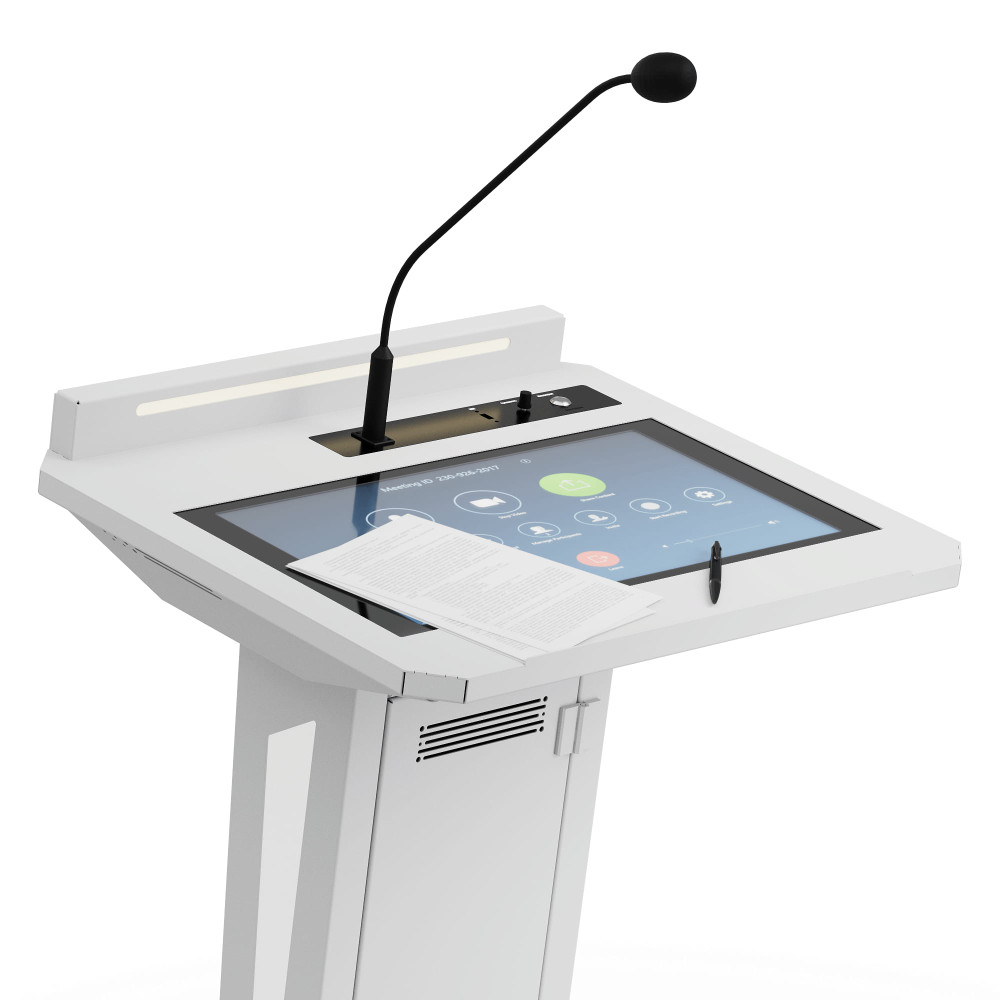 Стильный дизайн стального корпуса, атмосферная подсветка, сенсорный экран FullHD — это не только удобство в использовании, но и дополнительное привлечение внимания к спикеру. Встроенные стереодинамики и микрофон на «гусиной шее» с функцией ветрозащиты и подавления шумов обеспечивают чистый и четкий звук. А мощный процессор поможет быстро воспользоваться необходимыми для выступления материалами.