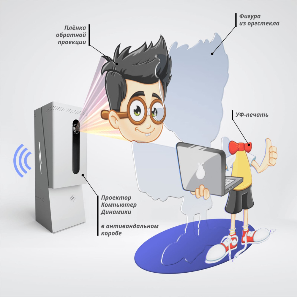 Промоутер — это обратная проекция героя/человека, транслируемая на конструкцию из оргстекла с пленкой. Сам проектор и динамики спрятаны в универсальный стильный металлический короб. Промоутера можно дополнить сенсорным оборудованием и создать уникальное средство для коммуникации с вашими клиентами! Привлекает внимание! Не надо платить! Работает 24/7!