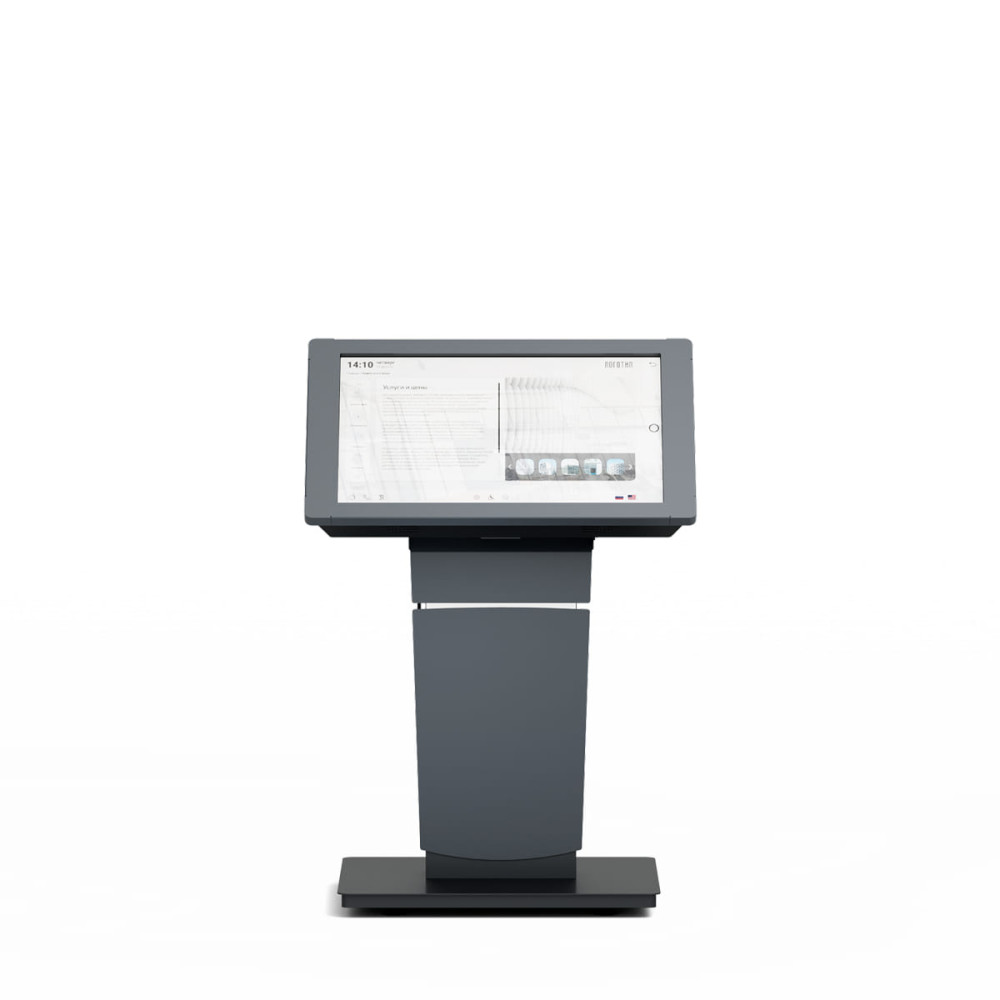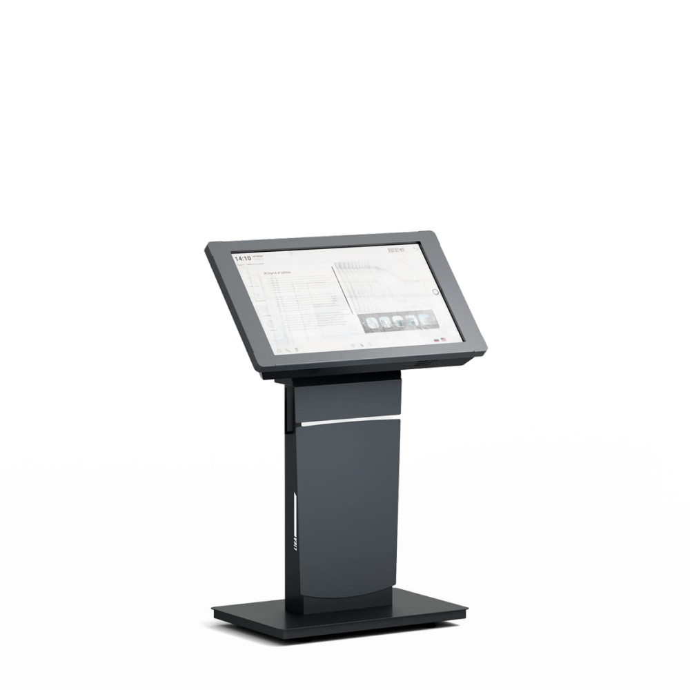 Легко впишется в интерьер за счет стильного корпуса с футуристической подсветкой. Может подстроиться под рост пользователя за счет поворотного экрана, с изделием комфортно работать и взрослым, и детям. Инфракрасный сенсор имеет четкий и быстрый отклик, а сам экран оптимальную яркость для использования внутри помещения. Удобное обслуживание оборудования обеспечено за счет дверцы на задней части корпуса.