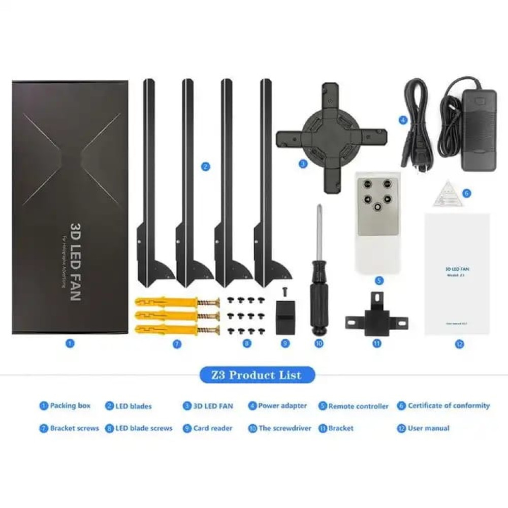 Светодиодный 3D голографический вентилятор Z3 (65см) - устройство представляет собой пропеллер со светодиодами, которые включаясь в определенное время при вращении создают парящее в воздухе яркое трехмерное изображение с эффектом голограммы.